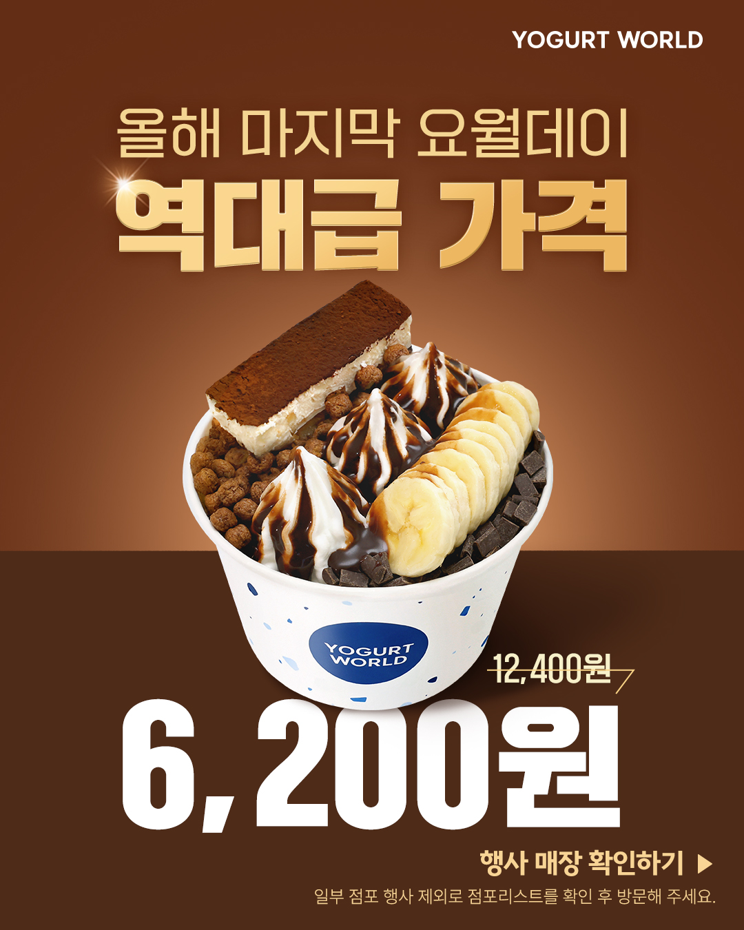 한편, 요월데이 할인 프로모션은 일부 점포는 제외되며, 행사 매장은 요거트월드 공식 홈페이지 및 SNS에서 확인할 수 있다.