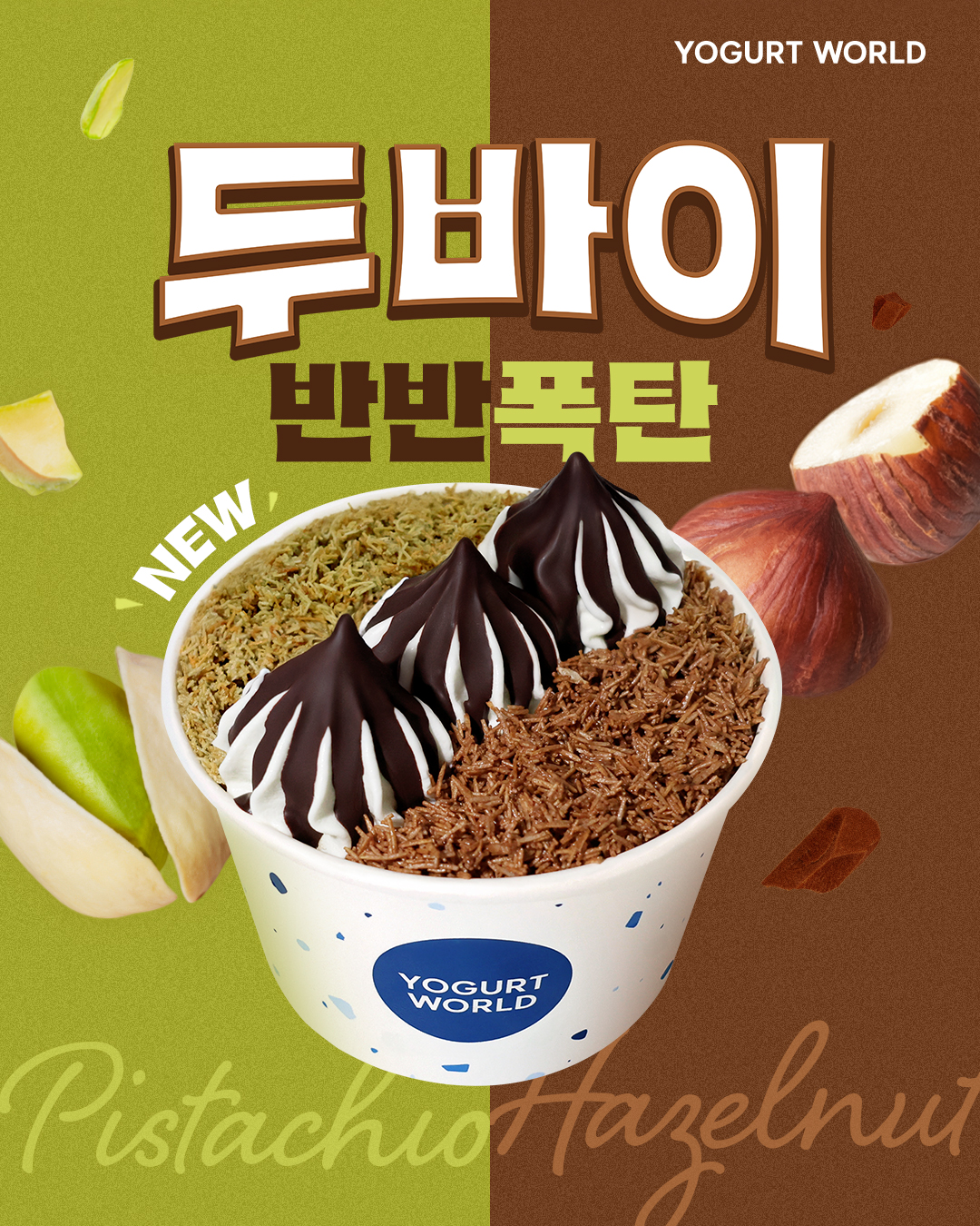 이번 신메뉴 두바이반반폭탄은 새로운 토핑인 피스타치오 카다이프와 요거트월드의 인기 토핑인 헤이즐넛