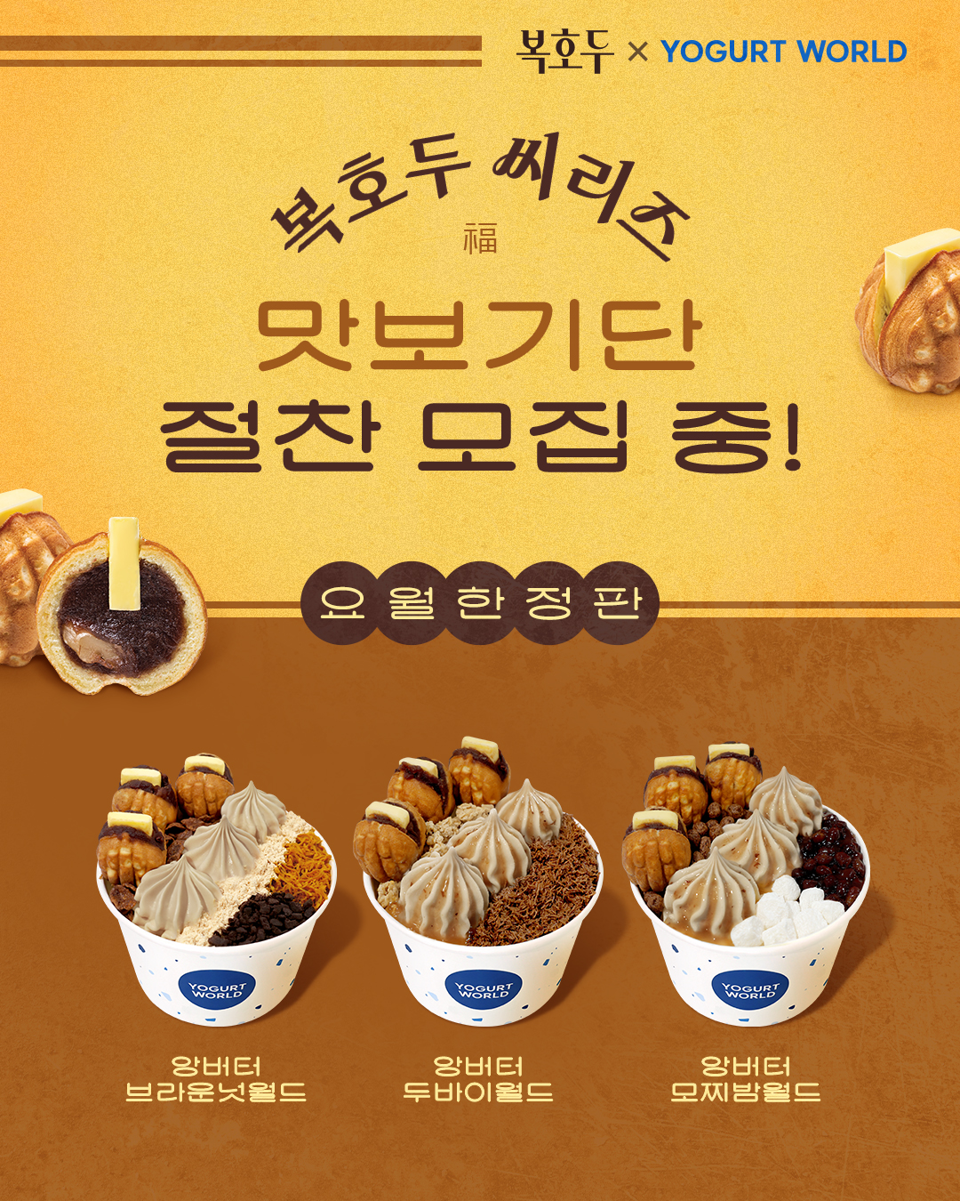 디저트 카페 프랜차이즈 요거트월드가 호두과자 브랜드 복호두와 손잡고 오늘 16일부터 시즌 한정 콜라보 메뉴 3종을 출시한다고 밝혔다.