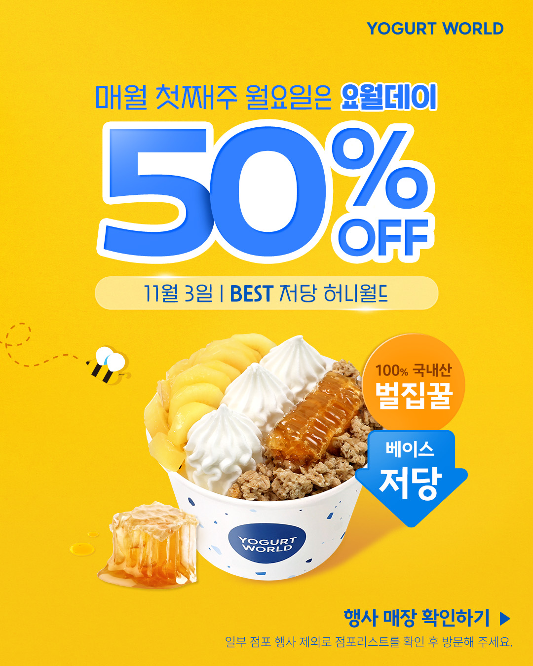 요월데이는 매월 첫째 주 월요일 단 하루 동안 이달의 메뉴를 반값에 제공하는 요거트월드의 대표 이벤트로, 합리적인 가격에 시그니처 메뉴를 즐길 수 있어 매번 뜨거운 호응을 얻고 있다.